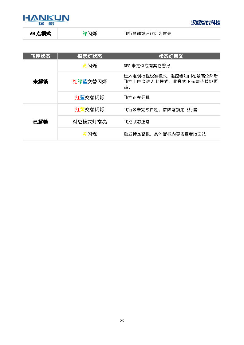 | 定位模式 | 绿蓝交替闪烁 | 飞控已过初步自检,且GPS未定位 |