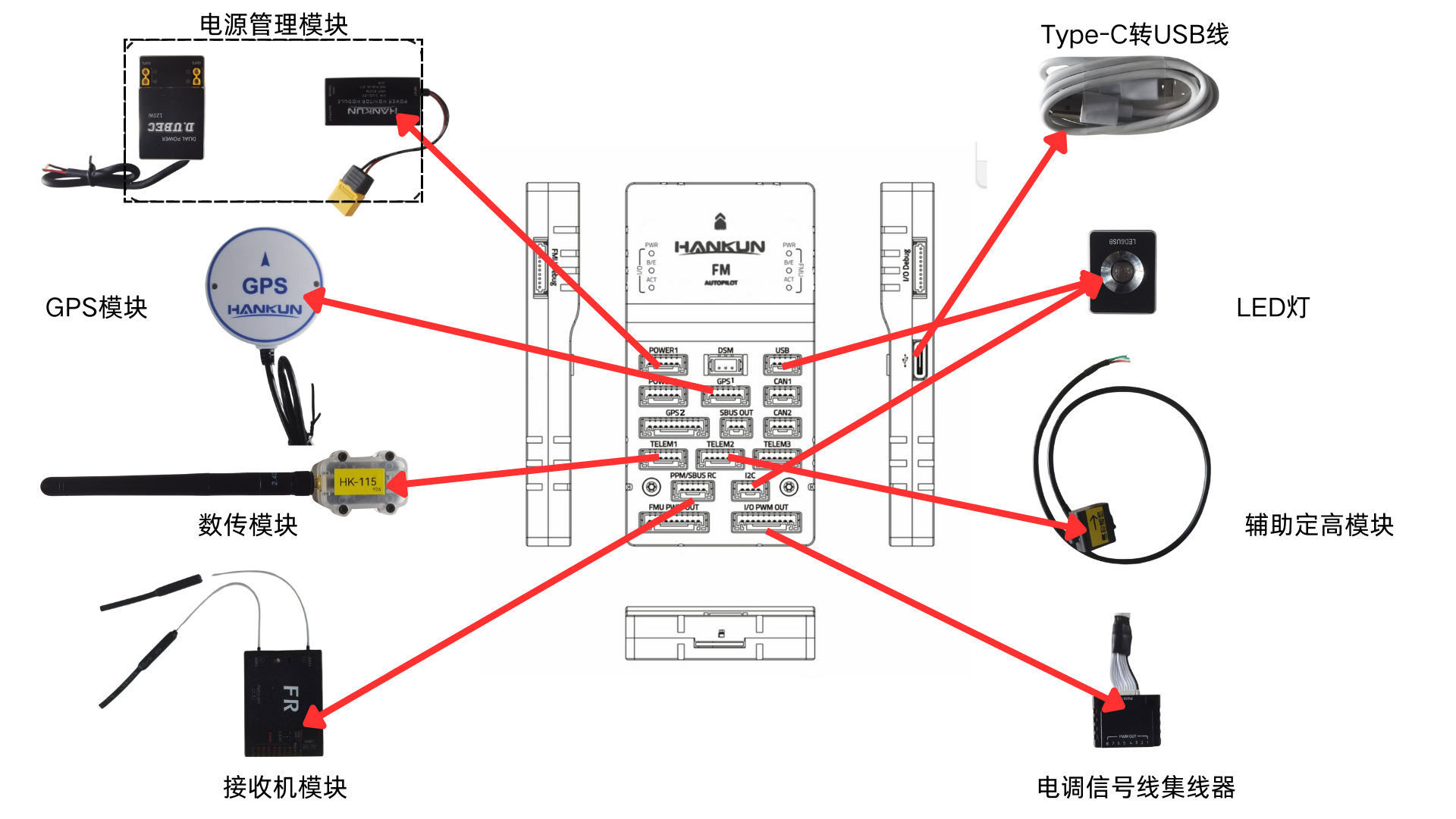 对于仅购买汉鲲飞控的用户,在飞控正确安装在飞行器上且飞行器组装完成后,需按顺序逐个完成下方步骤