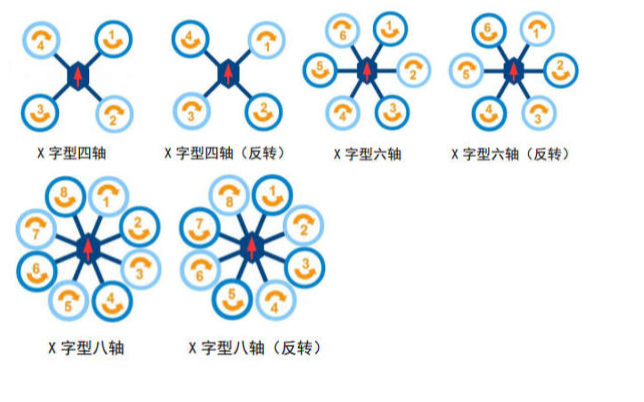 2.飞行器切换至姿态模式,逐个测试电机转向以及位置,与左侧图示比较看是否一致