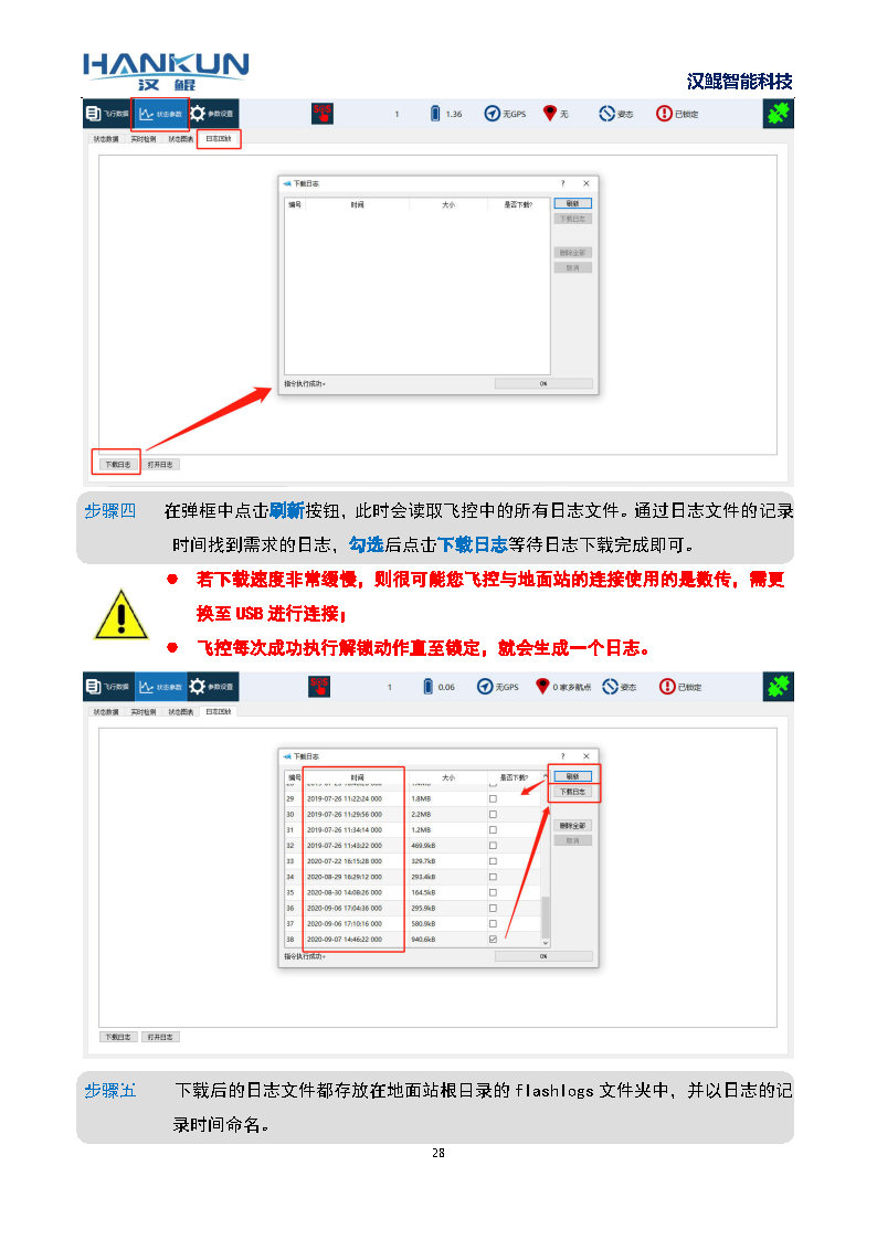 通过软件操作可进行日志回放,日志为飞行过程中记录的所有的数据信息。这些数据信息可用于分析还原当时飞行器的状态,操作指令等。